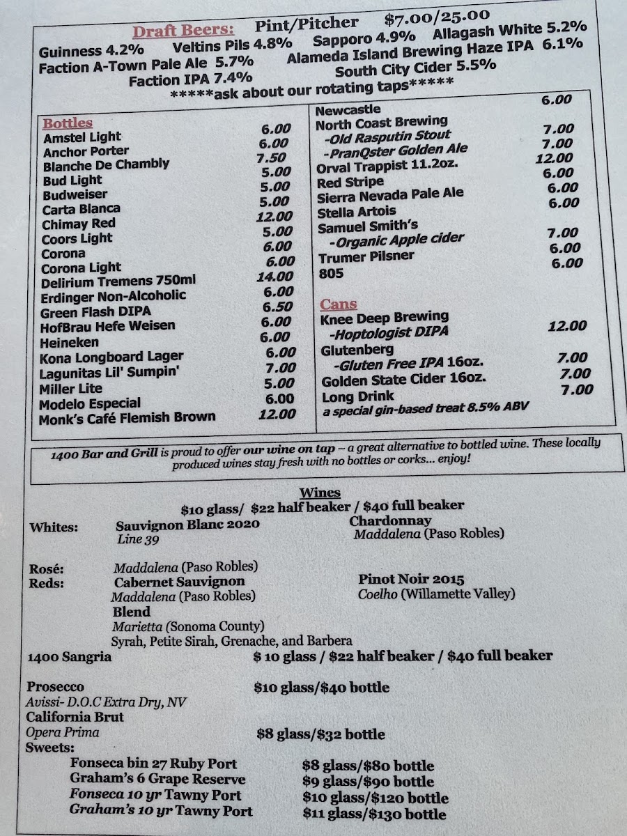 Welcome to 1400 Bar & Grill, a hidden gem nestled in the heart of Alameda, California. Located at 1400 Webster St, this vibrant bar and grill is the perfect blend of friendly ambiance and delectable food that promises to impress both locals and visitors alike.
